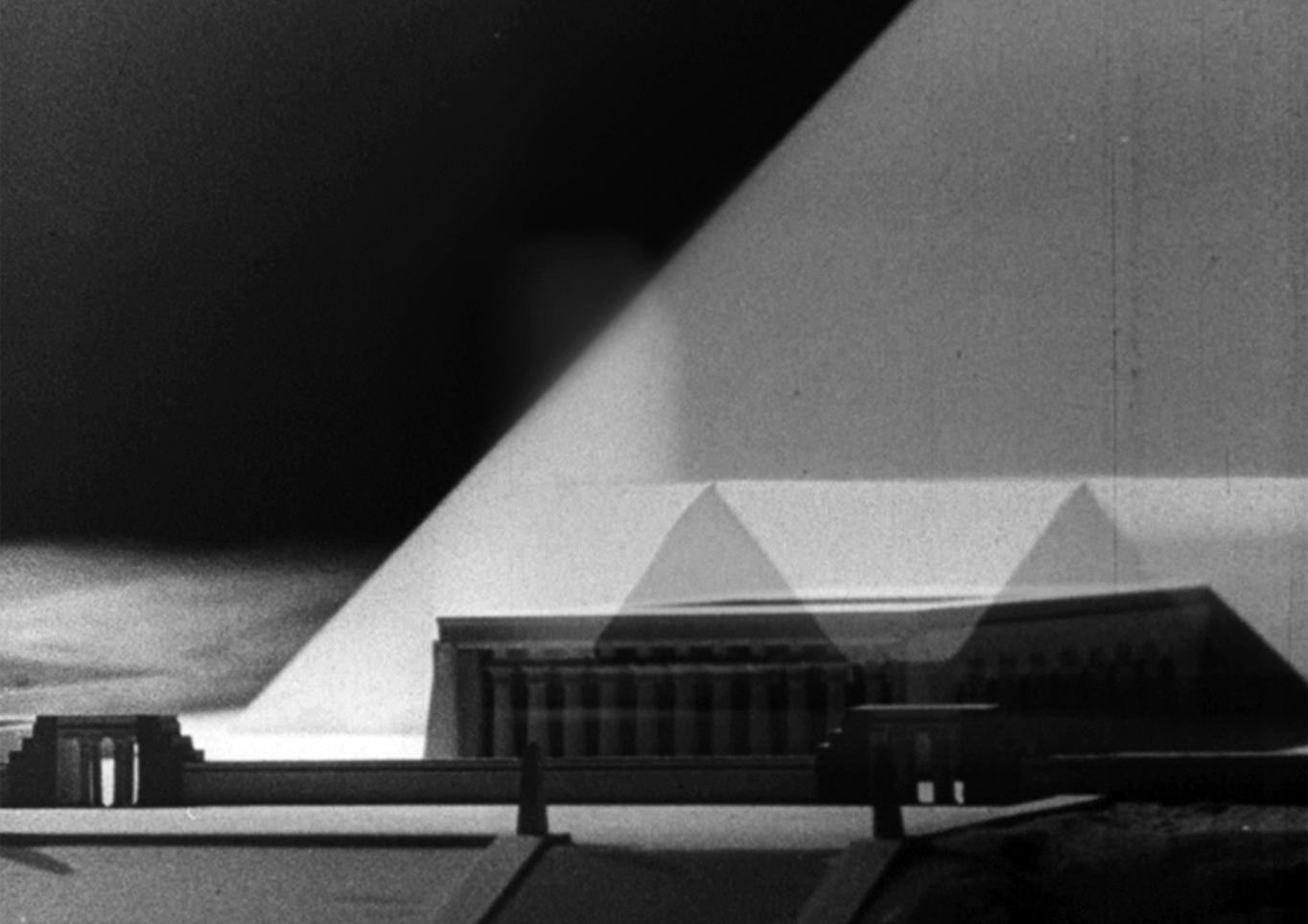 TED-Stadt (2016) is a journey filmed inside a model of an ancient Egyptian-style city. The city was planned in 1917 by the Expressionist artist Bernhard Hoetger for the German biscuit manufacturer Hermann Bahlsen, who sought to build a city for the benefit of his employees. The original model of the city was lost, and Russo has reconstructed it using architectural plans and photographs. Interwoven with Russo’s footage are shots from Anton Kutter’s 1939 propaganda film Germans vs Pharaohs, which proposed that the pyramids were actually of Germanic design. A deserted ghost town unfolds, with the camera wandering through streets, monumental buildings and pyramids, accompanied by an electronic soundtrack by musician Binya Reches.