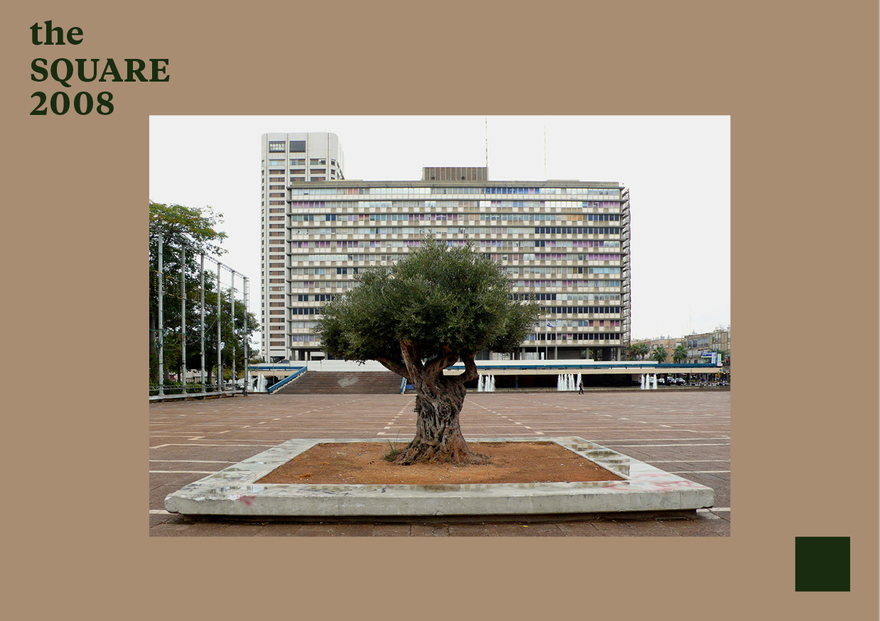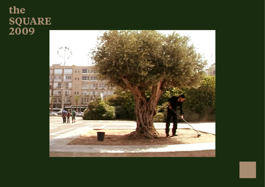 It is the song Hub (love), by Lebanese singer Ahmad Kaabour: speaking in the second-person plural, it addresses a Palestinian audience, expressing a sense of belonging and solidarity. The Palestinian narrative hovers over this short video work not literally but in an attempt to touch upon and avoid a cliché. Hattab, who was born in Yaffo and studied art at the Midrasha and Bezalel, lives and works in a Jewish society and expresses the dichotomy of his identity between cultures and places. The olive tree planted in Rabin Square, watered by the fountain’s water with a Lebanese song soundtrack, expropriates the Square of its Israeli distinctiveness, with its imprinted memories, and transforms it into a moment in a space that has no national attribution, that enables the existence of different memories, longings and pains all emerging from different directions.