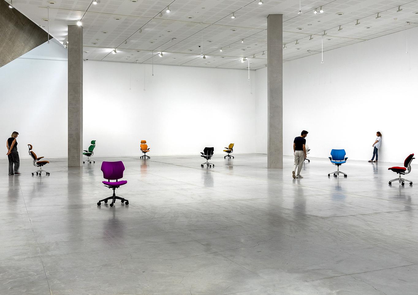 PLAY is a groundbreaking Artificial Intelligence work by the internationally renowned artist Urs Fischer: nine brightly colored office chairs move freely in the gallery, interacting with the viewers. Sculpture, human behavior, and choreography merge into a surprising and witty ensemble.