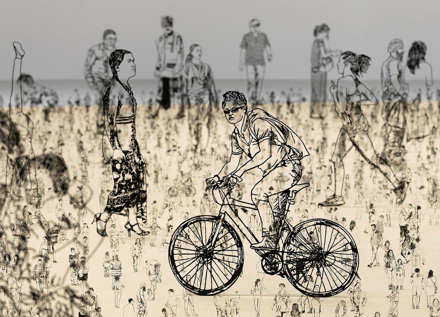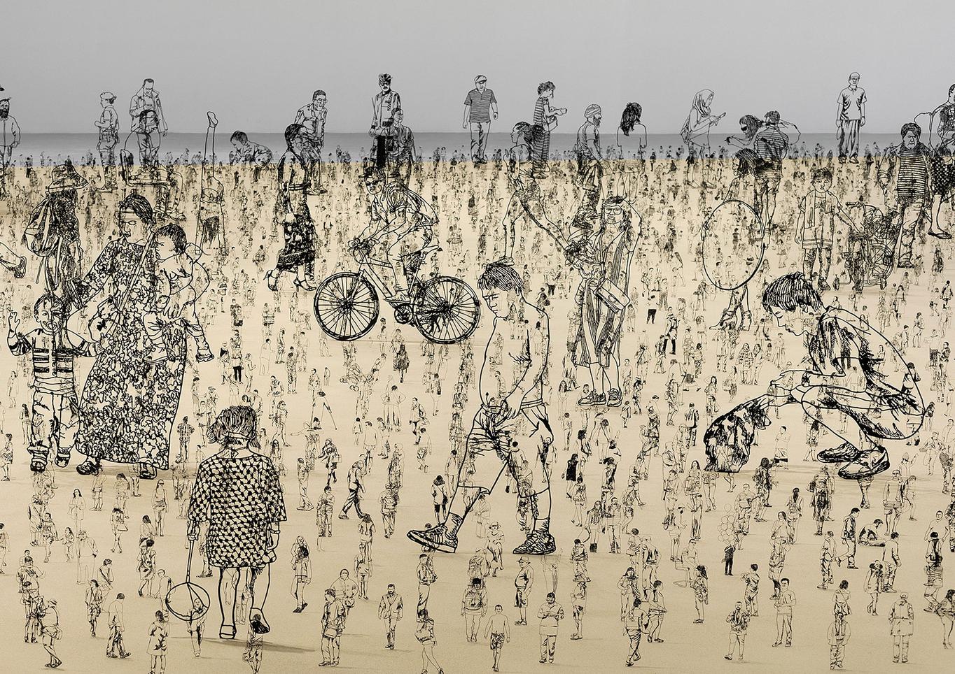 The installation People I Saw but Never Met includes more than six-thousand figures of men, women and children. These are people that artist Zadok Ben-David had seen during his travels around the world—in a market in Kazakhstan, on the streets of Tokyo, near his studio in London, on a beach in Tel Aviv, even in Antarctica—but had never met personally. Something in their presence—a facial expression, or a momentary gesture—caught his eye and made him take their photograph. He then sketched these photographs with pencil and later, by using photo-etching, he turned the sketches into a thin metal cut-out painted in black. The installation includes thousands of these small figures standing at equidistance on a bed of sand stretched across hundreds of meters, making for an intricate human landscape.