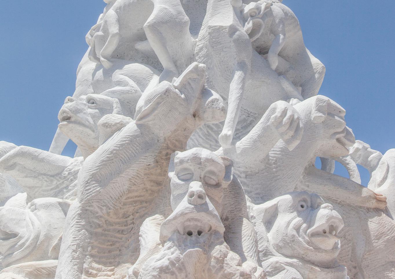 הפסל זוהר גוטסמן מציג מזרקה שחצב ידנית מגוש שיש שיובא מקררה שבאיטליה: למעלה מארבעים כלבים בהשראה הנעה מהגרגוילים בקתדרלות מימי הביניים ועד כלבי צ'יוואווה המשמשים כיום כאביזר אופנה. סביב המזרקה שיחי הדס וספסלי אבן, והמבקרים מוזמנים לשבת במעין קריצה לפיאצה איטלקית בלב המוזיאון. גוטסמן עוסק במתח בין חומרים גבוהים ובין ההרס שהוא גוזר על הפסלים לאחר הצבתם באמצעות חומרים המכתימים ומכלים אותם, כמו הזרמת יין במזרקה בערב הפתיחה.