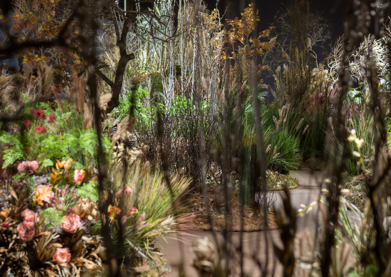In the installation The Garden, one eighth of an acre—the gallery’s total area—has been transformed into a plot full of knolls, trees, and bushes (some gathered in nature, others made of plastic and silk). Visitors are invited to wander among the paths illuminated by nocturnal light, where the sounds of nature can be heard.
