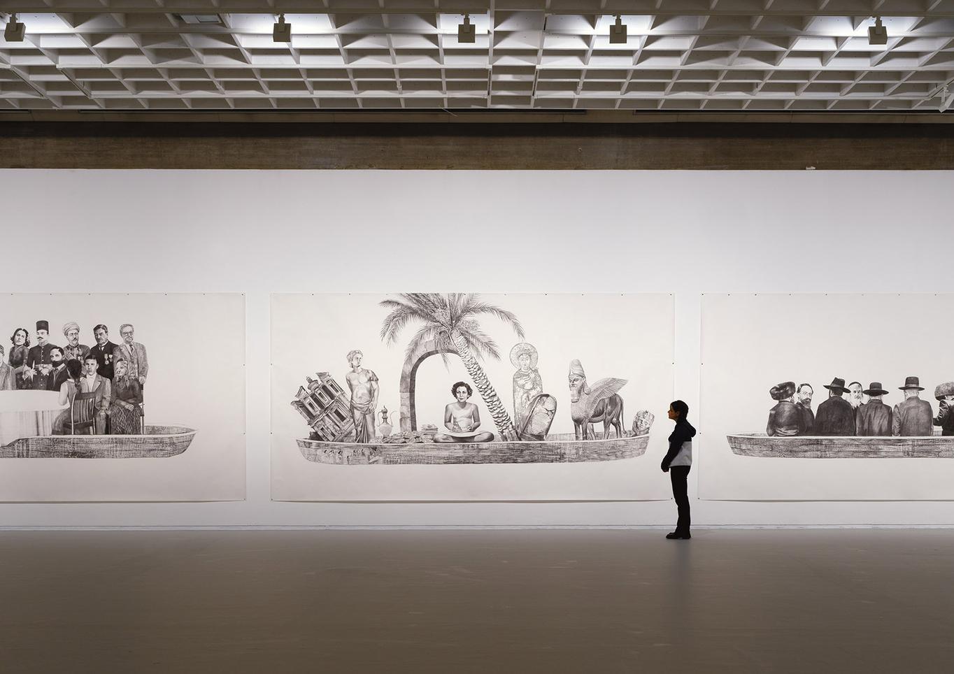Netta Lieber Sheffer is the recipient of the 2023 Haim Shiff Prize for Figurative-Realist Art. Her exhibition revisits historical crossroads concerning Jewish identity and settlement before Israel’s declaration of independence in 1948. In it, she presents eleven boats sailing through an empty space, each carrying figures and symbols from the past. Each boat raises a topic, ideology, or movement, with an impressive collage of individuals (who, in reality, may never have met) whose gathering creates an alternative narrative that might have been possible, even if only in one’s imagination.