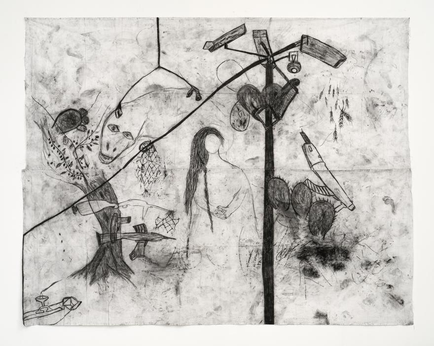 As part of her artistic ritual, she lays the canvas on the floor and works within it with bare hands and feet, leaving imprints where they touch the surface, while her eyes observe the unfolding occurrence from above. Despite their monumental scale, Saleh Mahameed’s canvases evoke drawings on paper; these are free, dynamic paintings that provide space for visual and conceptual exploration. Her inspirations range from the ancient past to the present—from prehistoric cave drawings, through Edvard Munch and Ana Mendieta, to William Kentridge. The surface of the painting is energetic and sooty, carrying ancient and mythical imagery: vegetal elements (wheat, sabra hedges, vine) representing time’s cyclicality; fertility symbols (bird eggs, pregnant women); and semi-human beasts interacting with human figures.The artist’s figure often appears in the paintings as a teenager or a young woman with flowing hair, frequently accompanied by animals, primarily horses and birds, which merge with her image, reflecting dynamic transformations between animal and human forms. The figures are depicted in states of bodily collapse: bound to external forces, trampled, vulnerable, and lacking spatial grip. The painting’s timeless space echoes the present through images that attest to an aggression-laden, violent reality, such as surveillance cameras, medical devices, bulldozers, and weapons. “Whenever I feel blocked and have difficulty getting the painting started, I depict horses. Despite my great fear of them, following a childhood accident, I am deeply drawn to this noble animal, to the way it stands tall in space. Through the horse, I feel free to act in painting, without fear.” Saleh Mahameed’s words suggest that her entry into the creative process through the trauma sets the painting in motion, linking it to renewal and healing. The exhibition’s title, Peace of Mind (Rahat al-Rūh in Arabic), expresses the spiritual aspiration for inner peace and reconciliation set against the existential struggle.
