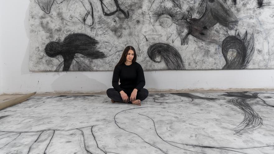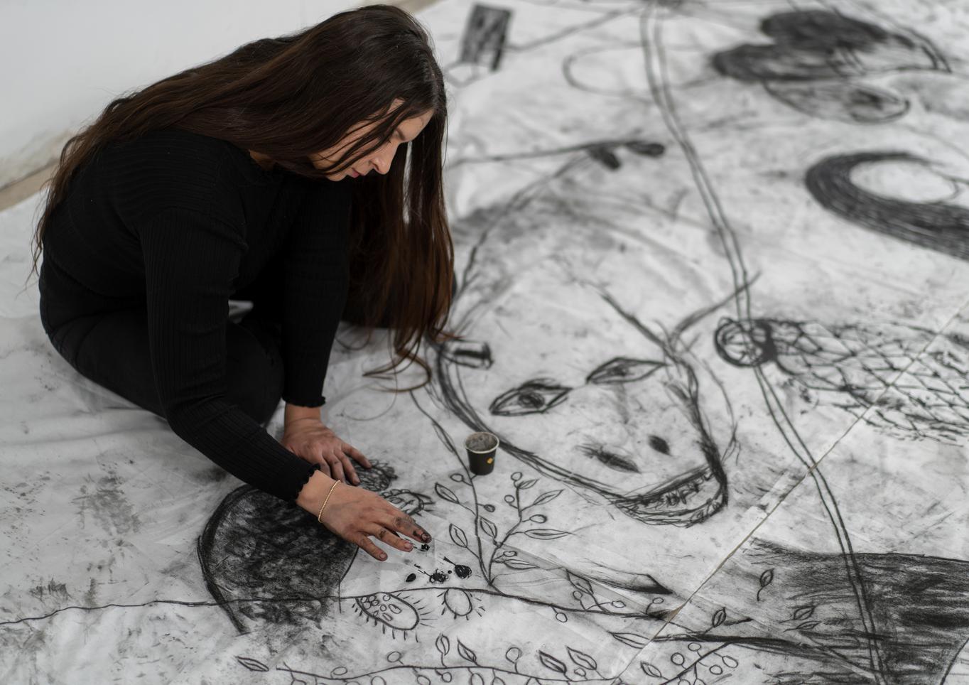 Maria Saleh Mahameed (b. 1990, Umm el Fahem; lives and works in Ein Mahel) presents a body of work created during the months of war. The daughter of a Ukrainian mother and an Arab father from Umm el Fahem, Saleh Mahameed often explores her complex identity, reflecting a charged, tangled political and social reality. Her monumentalcharcoal-on-canvas painting installations are rich in drama and veiled in mystery. They are underpinned by an intuitive, physical approach, incorporating movement, kneeling, and wallowing in the painterly surface.