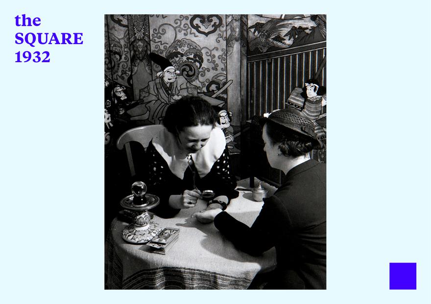 The year is 1932. A new museum is being opened in Tel Aviv, in Paris they are celebrating what Hemingway would later call “A Moveable Feast.” There are two people sitting in the wagon on Blvd. Saint-Jacques: a fortune teller, perhaps a gypsy, and in front of her an elegant woman, her hat worn slightly at an angle, in the rakish fashion of the time. The walls of the wagon are adorned with Japanese paintings, and from the particular angle at which Brassaï photographed this intimate moment — of a woman seeking to know what the future holds in store for her — a painted Japanese warrior appears to be emerging from the woman’s hat; it seems like a second, prosthetic head, exotic but also foreboding. On the tablecloth, next to various Far Eastern paraphernalia, is a deck of cards, for the fortune teller’s use when forecasting the future for her customers. In the meantime, she holds the woman’s palm, and is examining it with a magnifying glass. What does she see? Love? Money? Happiness? Does she see war on the horizon? Occupation? Does she see even a hint of everything we already know about the future of 1932? Brassaï’s Paris is still far from all of that. It is reveling in the freedom proclaimed by Surrealism, drawn to mysticism and exoticism, and celebrating being the center of the art world. In the frozen moment of this photograph, the Japanese warriors painted on the walls of the wagon are the only harbingers of what is about to happen — which we recognize only in hindsight. The future of the twentieth century is imminent, and the journey to the Square is also beginning, with a fortune teller reading a woman’s palm.