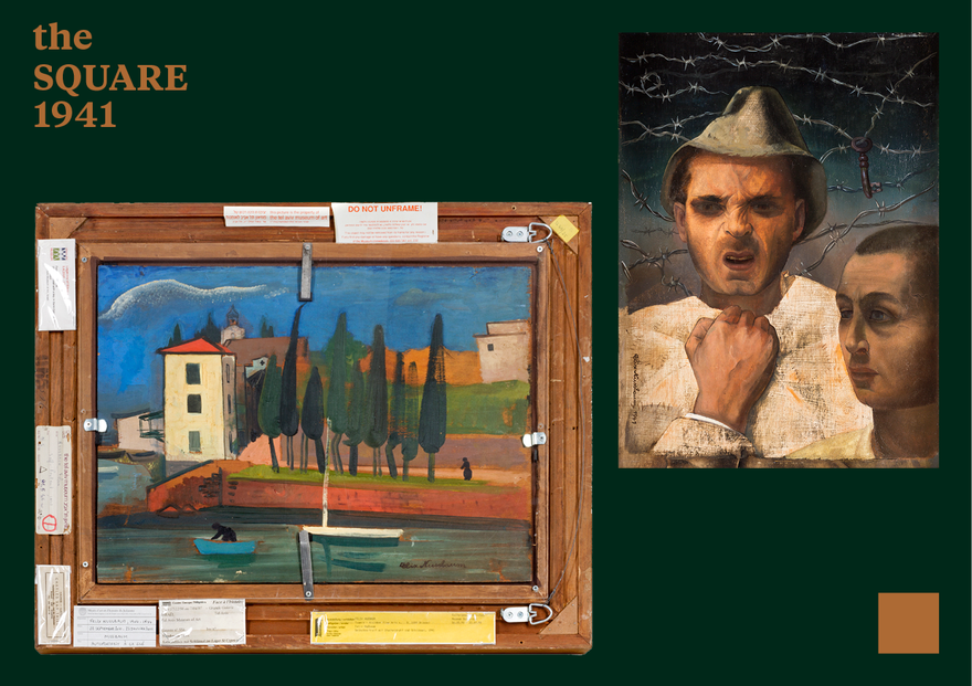 The year is 1941, once again at 22 Archimedes Street. Nussbaum is painting his self-portrait as an inmate at the Saint-Cyprien camp, alongside another inmate. A barbed wire fence, a key, and an expression of rage are new features in his work, courtesy of Saint-Cyprien. On the flip side of the same piece of plywood he paints a distant memory from Rome, where he stayed in 1932 with Platek at Villa Massimo, the local branch of the Weimar Republic Academy of Arts. Depicting a boat in a river, an open landscape, and an atmosphere of leisure and freedom, the verso of the painting is like an apparition from another era.