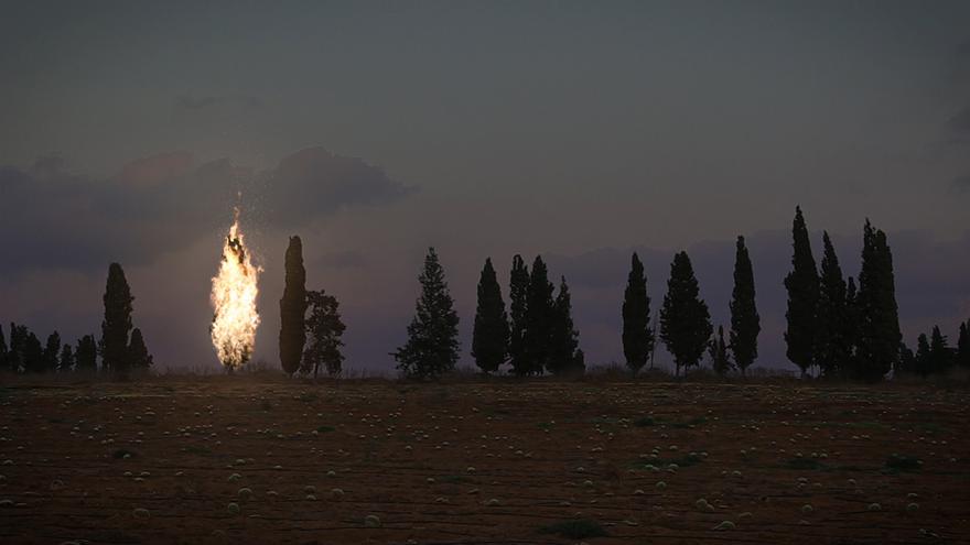 Daniel Kiczales’s row of cypresses surrounds a typical landscape – a field of ripe watermelons at sunset. One of them is on fire. Often found in cemeteries, the cypress tree, graceful and durable, remains standing despite its burning crown. The sight reflects at once a foreboding sense of danger, yet there is a glimmer of hope: the burning tree echoes the biblical burning bush that is on fire but was not consumed by the flames. [Hefer Valley]