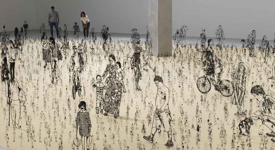 The installation People I Saw but Never Met includes more than six-thousand figures of men, women and children. These are people that artist Zadok Ben-David had seen during his travels around the world—in a market in Kazakhstan, on the streets of Tokyo, near his studio in London, on a beach in Tel Aviv, even in Antarctica—but had never met personally. Something in their presence—a facial expression, or a momentary gesture—caught his eye and made him take their photograph. He then sketched these photographs with pencil and later, by using photo-etching, he turned the sketches into a thin metal cut-out painted in black. The installation includes thousands of these small figures standing at equidistance on a bed of sand stretched across hundreds of meters, making for an intricate human landscape.